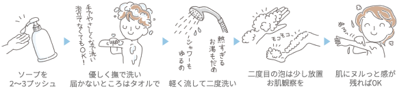 力を入れない、ゴシゴシこすらない。かけ湯程度で流しましょう。シャワーを利用する際は、勢いをゆるめ、軽くかけ流します。
