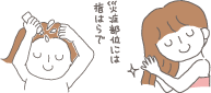 タオルドライしたあと、頭皮毛髪専用ローションを頭皮に、軽くなじませます。頭皮の気になる部分はミルクを指腹でやさしく。パサついた髪の艶出し、枝毛、切毛部分には、乾いた髪に直接トリートメントで部分ケア。